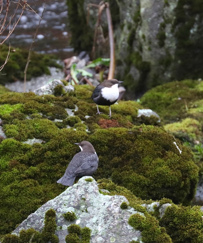 Koskikaroilla on on omat reviirinsä, on hyvin harvinaista saada niitä samaan kuvaan. Sukellellessaan ne eivät ole samalla, edes vierekkäisillä kivillä.