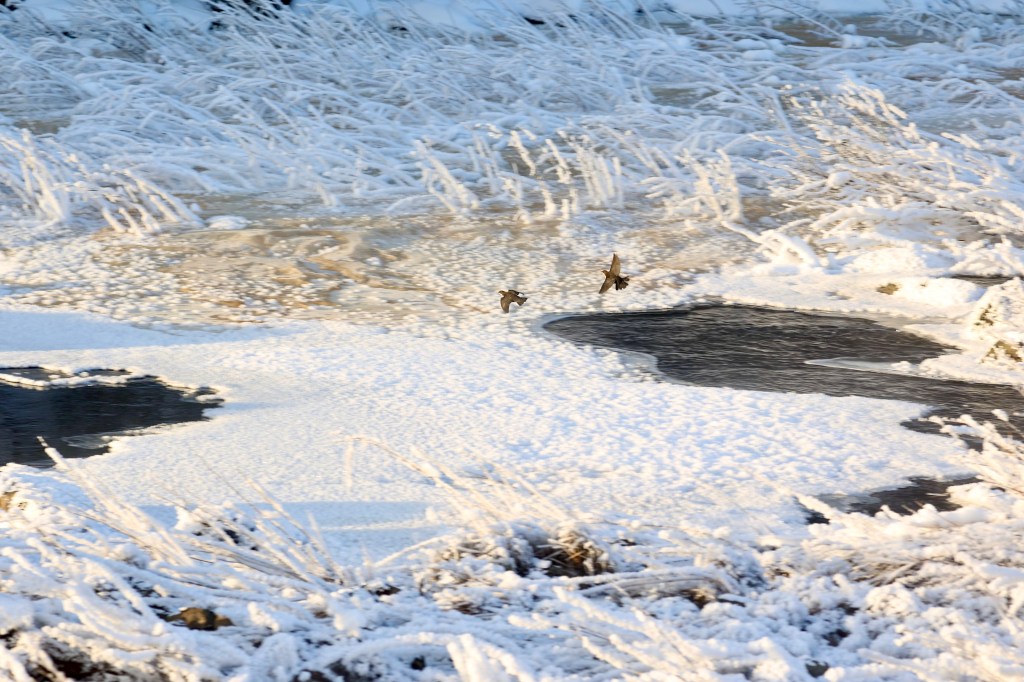 Koskikarat lentävät melko matalalla kosken yllä ajoittain vilkkaastikin. Koskikaraparin kisailu tuntuu välillä melko hurjaltakin.