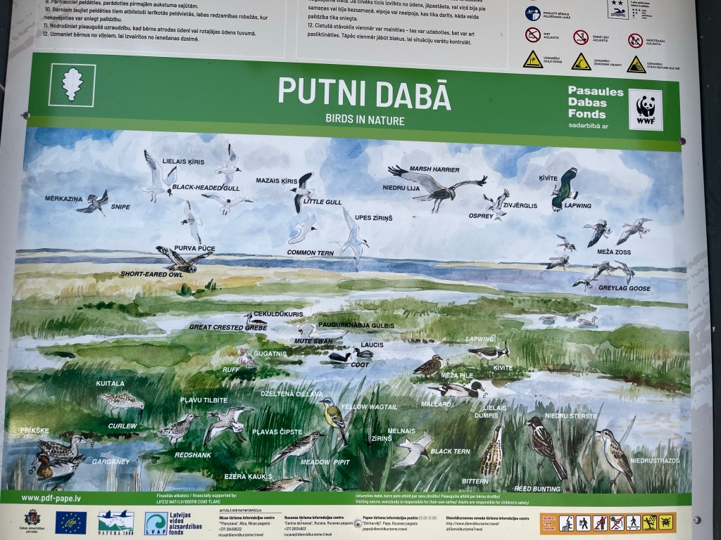 Rantamaisemissa olemme jälleen, paikkana Papen luonnonpuisto. Taulun linnusto näyttää lupaavalta. Ajoimme tänne Papen luonnonpuistoon oikeastaan sen takia, koska täällä on villihevosia. Ikävä kyllä emme nähneet hevosia, emmekä kyllä oikeastaan lintujakaan, mutta eipä tuo haitannut. Ja sitten saavumme Liettuaan.Palanga. Ranta-alueen keskus ja maamerkki Palangos Tiltas. Laiturin yläpäässä, mäessä, oli kummallakin puolen muutama penkkirivistö. Laituri, ranta ja rantabulevardi olivat oikein hienot. Keskustasta ei jäänyt oikein minkäänlaista kuvaa. Rantaan pääsee useammasta kohtaa katettuja reittejä pitkin.Palangan ranta.