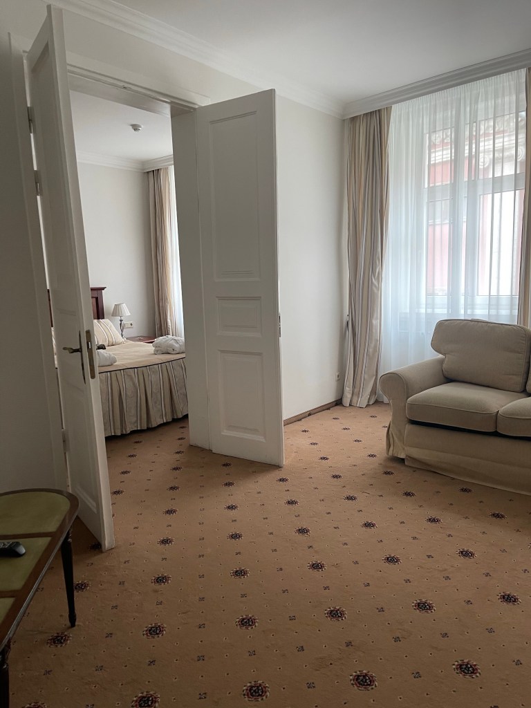 Meidän huone, sviitti. Tämä oli edullinen huone, 77.28e/yö. Tein tämän varauksen, kuten kaikki muutkin reissun hotellivaraukset Bookingin kautta. Tilaa huoneessa oli huomattavan paljon, mutta kieltämättä pientä päivitystä huone olisi kaivannut. Hyvin täällä kuitenkin viihdyttiin.Hotellin parkkipaikka.Näkymä parkkikselta.6.5. Sadepäivä, eli lepopäivä. Syömään oli kuitenkin päästävä ja vähän katseltiin samalla vanhaakaupunkia. Kuvassa Mustapäiden talo. Tämä gotiikan tyylisuuntaa edustava talo on alunperin rakennettu 1334 suurelle killalle ja 1400-luvulla se päätyi Mustapäiden killan käyttöön. Mustapäiden kilta on ulkomaisten kauppiaiden veljesjärjestö. Rakennus tuhoutui toisessa maailmansodassa, mutta se rakennettiin uudelleen 1990-luvulla. Lisää aiheesta; WikipediaBremenin soittoniekat. Bremenin kaupunki lahjoitti tämän monumentin riikalaisille vuonna 1990. Alkuperäisversiossa sijaitsee Bremenissä.Intialaista, ravintola Indian RajaVielä sateista näkymää Jäna ielalta. Nyt lepoa ja kohti toripäivää.7.5. Päivä lähtee käyntiin hotellin aamiaisella. Aivan huikea aamiainen tässä meidän hotellissa👏. Valikoima uusiutui joka päivä. Tuli muuten nukuttua hiukka huonosti. Aivan meidän ikkunan alla sijaitsi nimittäin Rock Café-ravintola ja porukkaa mesosi terassilla aamuun asti. Ravintola on nimittäin auki kuuteen aamulla. Kannattaa pitää tämä seikka mielessä, jos haluaa majoittua ko. hotellissa, huoneita löytyy kyllä myös sisäpihan puolelta. Aamiaisen jälkeen marssimme respaan kysymään mahdollisuutta huoneen vaihtoon. No, se olisi kyllä onnistunut, huone olisi ollut vaan pienempi. Virkailija sanoi että seuraava yö on varmasti rauhallisempi, koska edellisyön juhlinta johtui 7.5. olevasta yleisestä vapaapäivästä. Halusimme harkita huoneen vaihtoa vielä seuraavaan päivään ja hyvä niin, koska seuraavat 2 yötä olivat huomattavasti rauhallisempia👍.