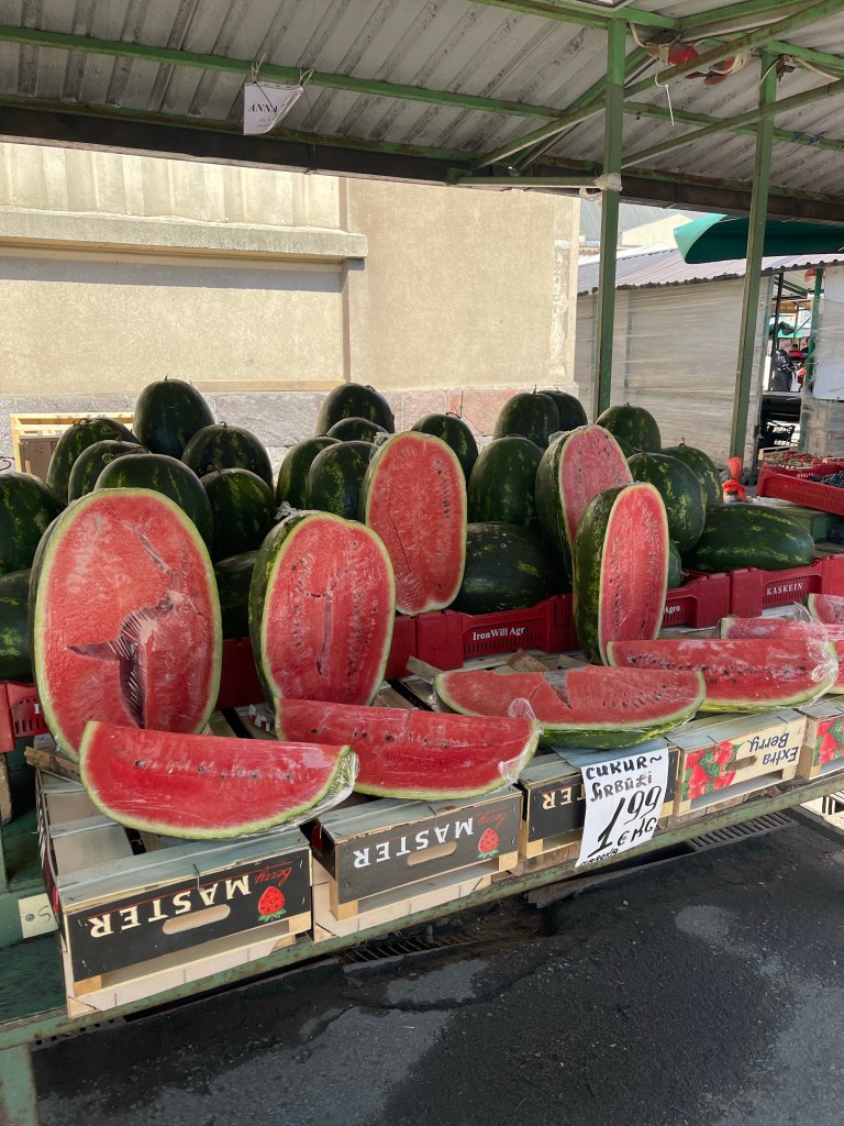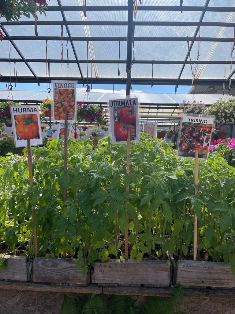 Kahvilaravintola Sasliks Uzbeku aivan paviljonkien vieressä. Täytyi tulla välillä lepotauolle kahvin ääreen tänne meidän kantikseen😀. Eli siis me on käyty täällä aina samalla kun on käyty täällä torilla. Halpa paikka ja löytyy sekä juotavaa, että syötävää. Sisustus lyhyesti sanottuna karvalakkimallia. Nyt taisi olla vasta avaamassa, oltiin ainoat asiakkaat ja selvästi takana oli esivalmisteluja käynnissä. Tämä pieni lepotauko teki hyvää, lähdetään seuraavaksi tutustumaan ulkotorin antiin.Saskils UzbekuVihannestori on täällä aivan valtava. Kaikki näytti täällä niin tuoreelta ja kauniilta, olisi tehnyt mieli ostaa vaikka mitä. Yksi valkosipuli lähti lopulta mukaan.Ihania tomaatteja🍅.Ja mitä vesimeloneja!Valtavia granaattiomenoita.🍓Erikoisen mallisia viinirypäleitä.Sitten siirrytään kukkiin ja hyötyvihannesten taimiin. Aikamoista silmäkarkkia kerrakseen.Vaikeeta täällä on olla ostamatta mitään😊.Tomaatintaimien kohdalla lankesin🫣. Tulihan sieltä pari tainta ostettua ja tulivat jopa kotiin saakka ehjinä.Red Cherry ja Purple Boy läksivät mukaan. Purple Boy on täällä jo hyvässä vauhdissa, muutama alku on kypsymässä. Red Cherry kukkii myös voimakkaasti.