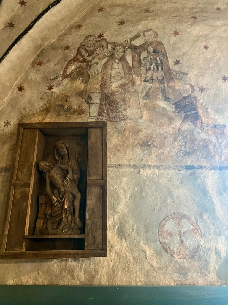 Kirkkoa kiertää Jeesuksen kärsimyksestä ja kuolemasta kertova kuvasarja Biblia pauperum eli köyhien raamattu. Kattoa ja holveja kiertävät kukka-aiheiset ornamentit.