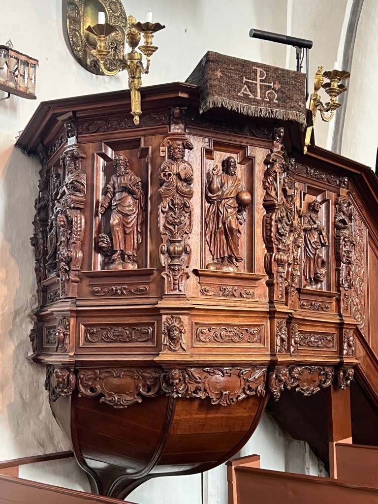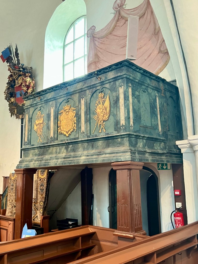 Kirkon seinillä on useita aatelissukujen hautausvaakunoita.