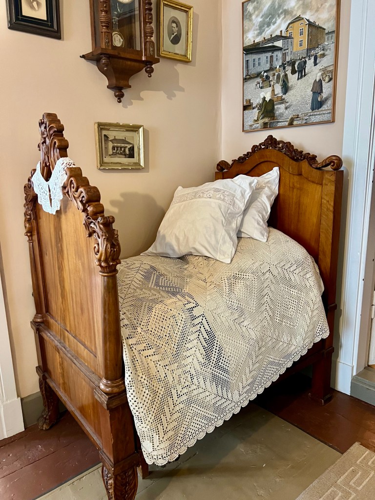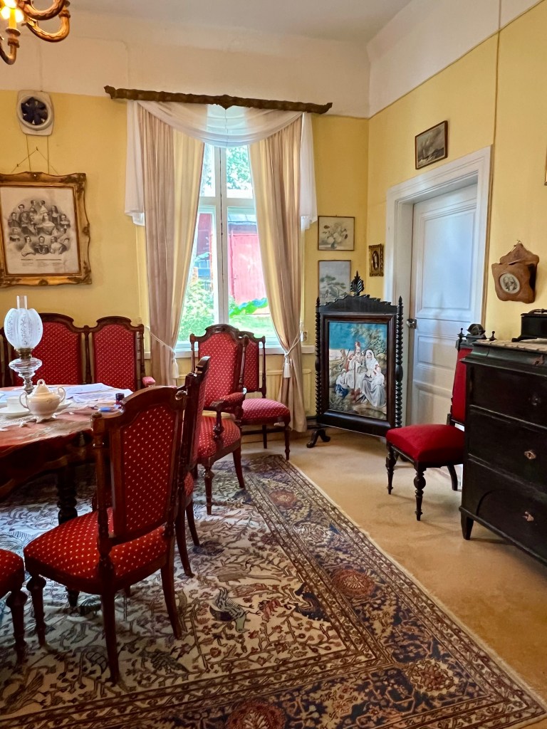 Perhe muutti empiretyyliseen rapattuun ja kalkittuun taloon vuonna 1842. Talossa oli 12 huonetta ja jokaisessa oli kaakeliuuni. Lattiat olivat kuusilautaa ja katot mäntyä.