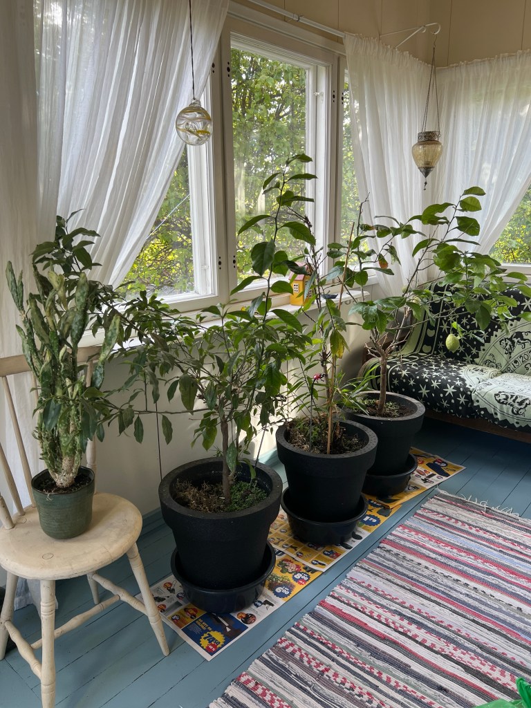 Syksyssä ollaan ja talvihan se jo tuolla kolkuttelee porstuassa. Tänään juuri käytiin huoltamassa meidän ilmalämpöpumput, että kyllä nyt kelpaa taas lämmitellä. Sitruspuut pääsivät lasitetulta terassilta hiukan lämpimämpään ja erittäin valoisaan paikkaa. Lasiverannalla jatketaan toistaiseksi kasvukautta, kunnes alkaa enemmän pakastaa. Talvimaja löytyy tuttuun tapaan yläkerran porrastasanteelta.