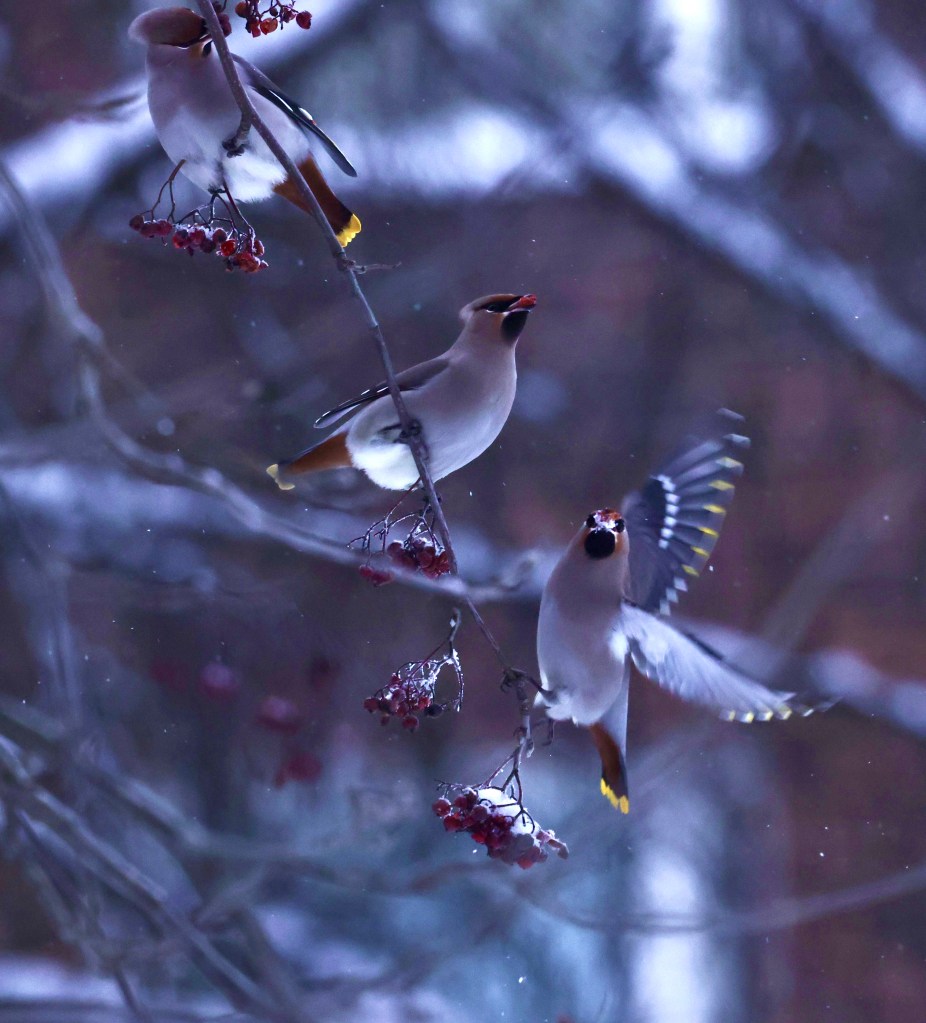 Alkuvuodesta käytiin Joensuussa ja silloin siellä kierteli ihan kaupunkialueella isoja tilhiparvia. Lähinnä kyttäsimme taviokuurnaa, joita oli nähty parinkymmenen linnun parvi samalla alueella, mutta eipä tietenkään satuttu näkemään. Olisi ollut kohdalle sattuessa elis. Täällä harvinainen vieras.