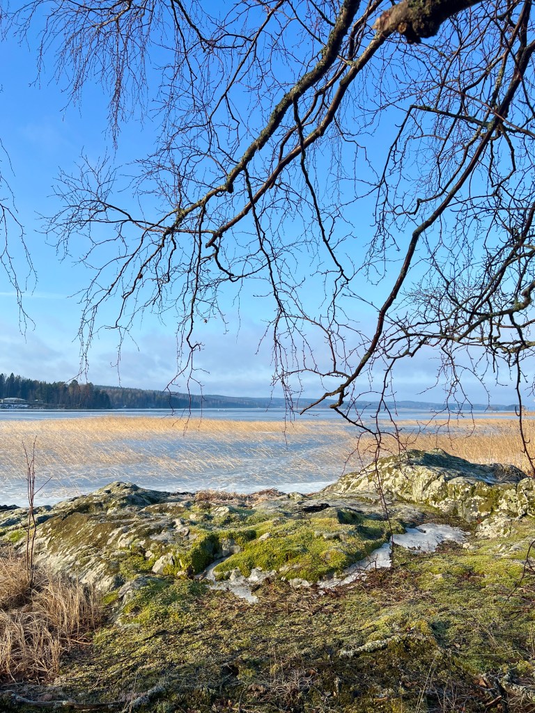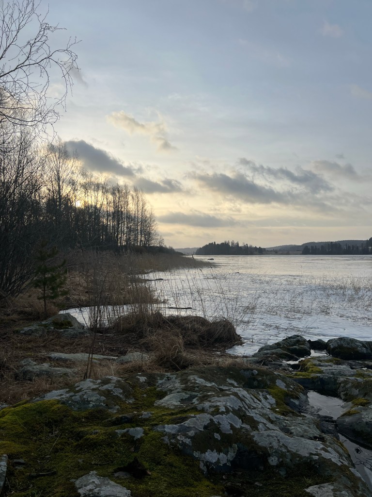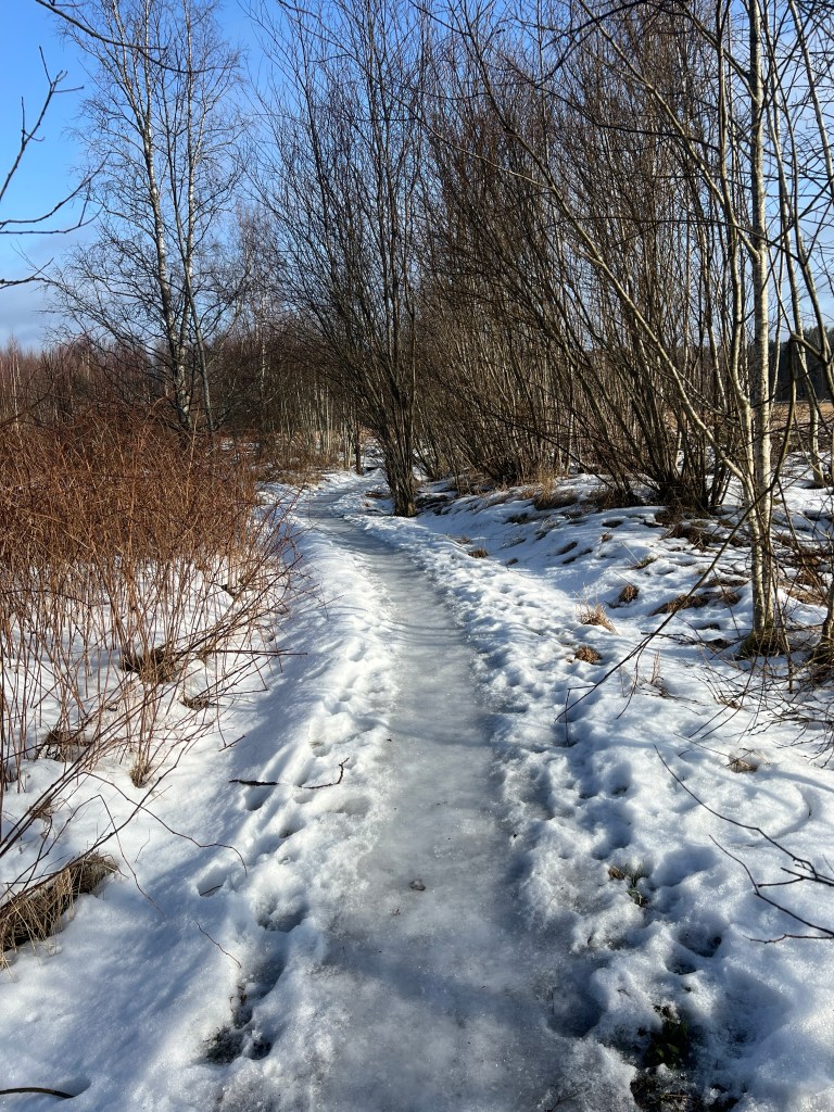 Oli ihanan aurinkoinen ja tuuleton aamu, eikä muuta ohjelmaa, joten ei muuta kuin Knuutilan rantaan katselemaan mitä löytyy. Hiukan arvelutti polut, jotka totuttuun tapaan ovat tähän vuodenaikaan jäässä. Eipä siinä muu auta, kuin pistää piikkiä kengän pohjaan.