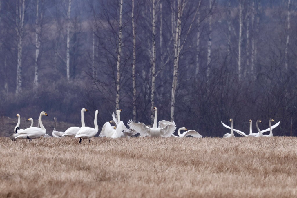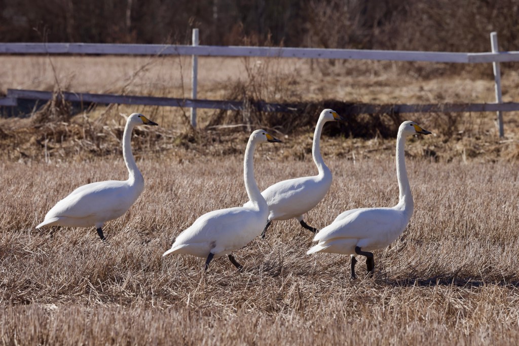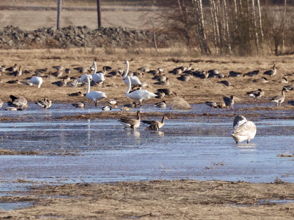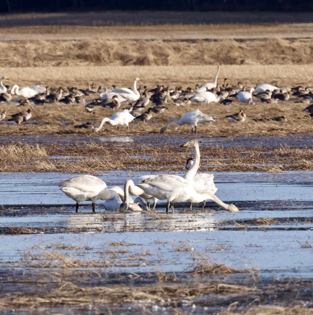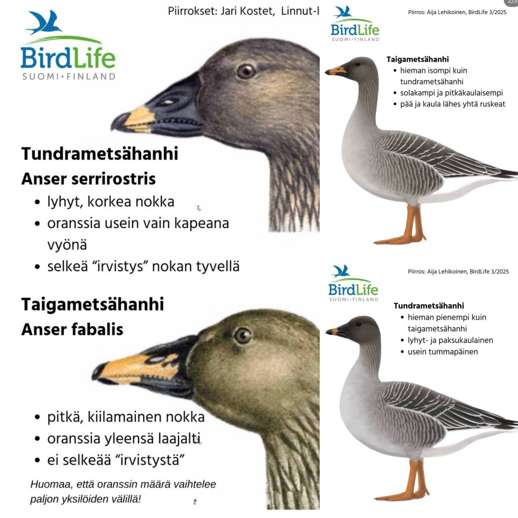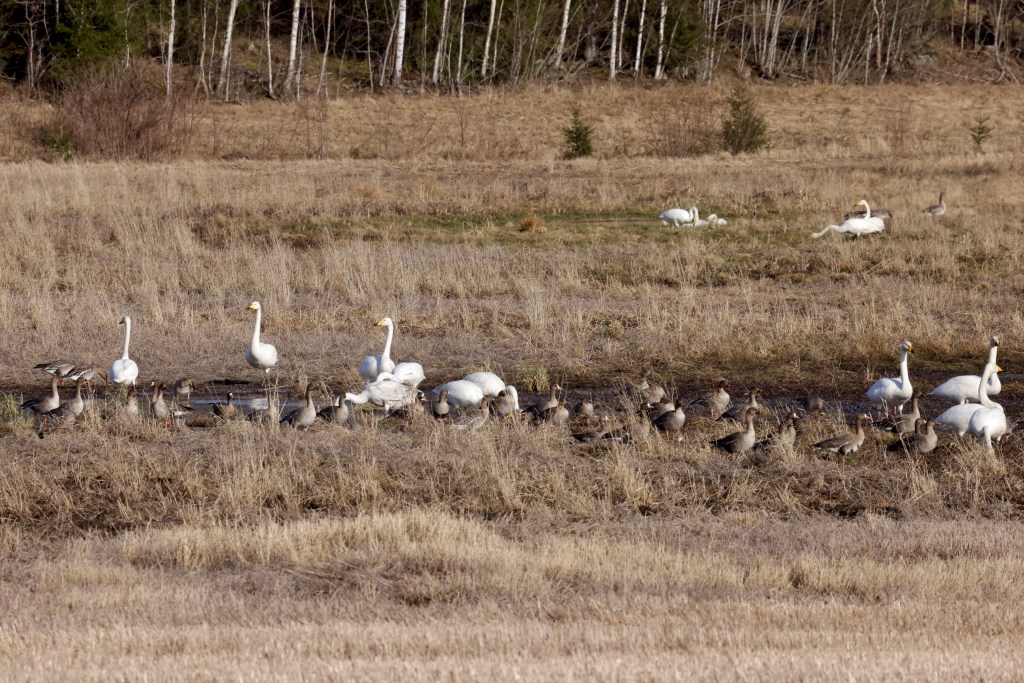 Kuvassa tunnistettavasti tundrahanhia, laulujoutsenia ja sinisorsia. Tundrahanhi ei pesi Suomessa, vaan ne pysähtyvät täällä ainoastaan muuttomatkallaan. Nämä Suomen kautta muuttavat linnut talvehtivat Pohjanmeren rannikkoseuduilla ja pesivät tundralla Siperiassa, Amerikan pohjoisosissa ja Grönlannissa. Lisää tundrahanhista ja kevätmuutosta mm. täältä: https://www.apu.fi/artikkelit/kevatmuutto-tundrahanhi-on-arktinen-vieras-itarajan-takaa